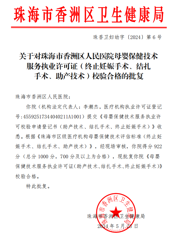 關(guān)于對珠海市香洲區(qū)人民醫(yī)院母嬰保健技術(shù)服務(wù)執(zhí)業(yè)許可證(終止妊娠手術(shù)、結(jié)扎手術(shù)、助產(chǎn)技術(shù))校驗合格的批復(fù)