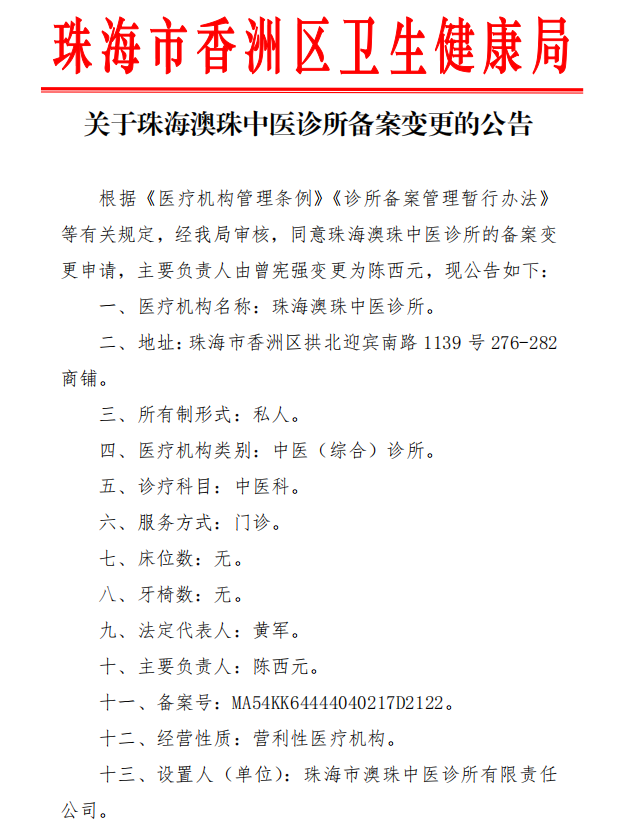 關于珠海澳珠中醫(yī)診所備案變更的公告